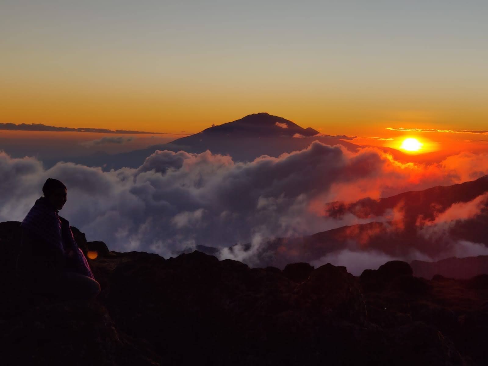 The day dawned beautifully clear and during breakfast the G Fighters took away the mess tent so we could sit in the sunshine. The pace today was really really slow. Mostly uphill with lots of big steps and rocky sections. The route was nice and every now and again we were treated to a great view. Even Mount Meru peaked it’s head out of the clouds at one point. The weather turned pretty nasty at the halfway point but we didn’t have to stop for lunch so we had a quick break and then carried on uphill. We arrived at camp at about half past one and had lunch then had a two hour nap before going on a really short hike to see a cave. We came back to some amazing singing from the G Fighters and then we had an introduction from all 35 people supporting our trip. There was time for a quick wash and then I stepped out of the tent to see one of the most spectacular sunsets I have ever seen. Dinner was a little questionable but we needed to eat something.