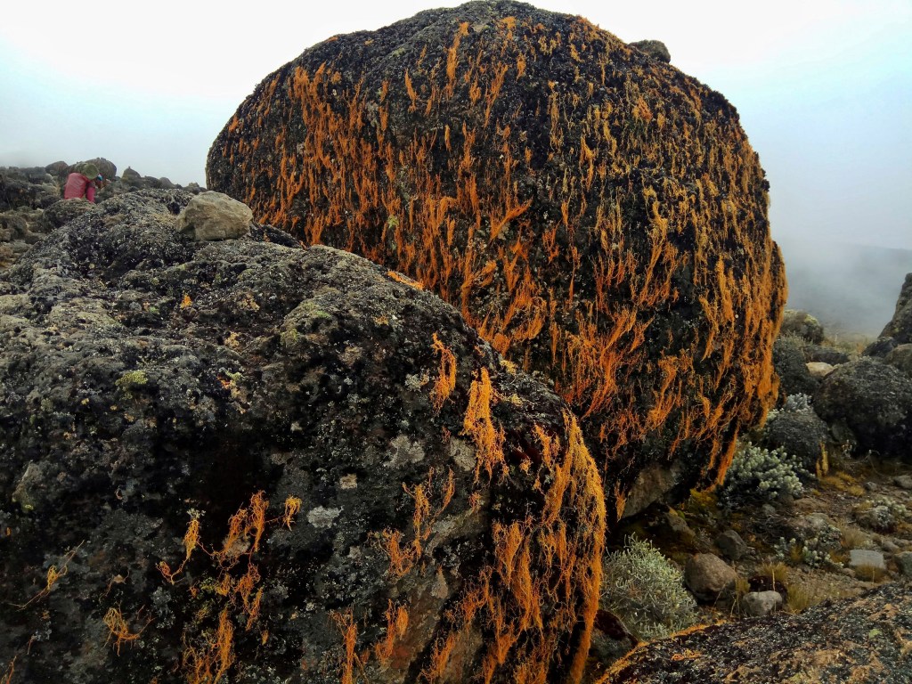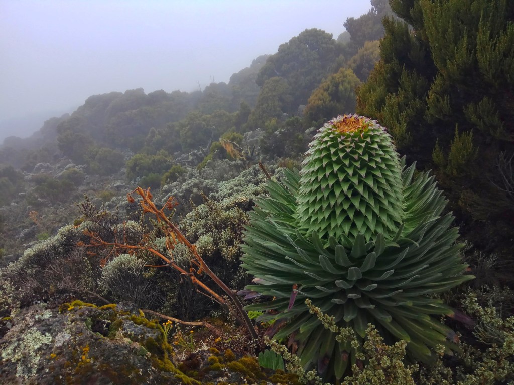 The first day on the Machame Route of Kilimanjaro was a really pleasant gradual ascent through a rainforest with trees completely covered in moss and lichen. There were also some beautiful wildflowers along the route, with an endemic species called Kilamanjia which look amazingly like an elephant’s head. The whole mountain was obscured from view in the clouds and eventually we got rained on enough for me to throw a poncho over my bag and I. Towards the end of the hike we emerged from the rainforest and out into a new landscape of tall heather. The campsite wasn’t far past that and the only drawback was having to hike uphill to the registration tent and then back down to our tents. But it was a lovely surprise to have really nice sleeping mats covered with shuka material.
