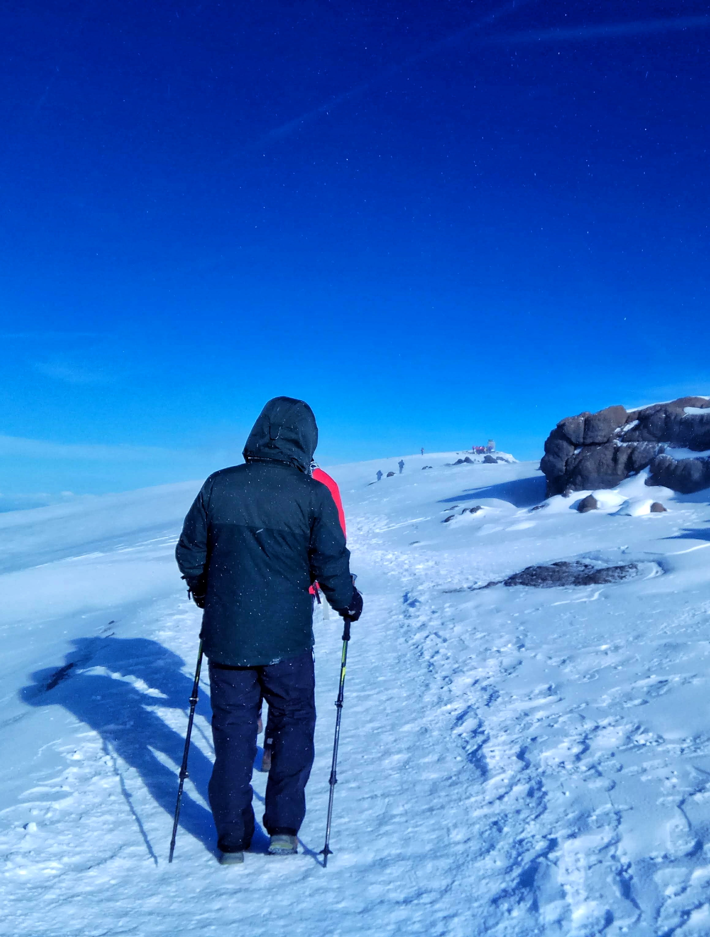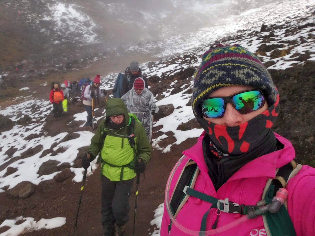 There was a lot of trudging and far too much waiting around because the queue of hikers on the thin trails made everything very similar to a traffic jam. The wind was fierce and it kept blowing up snow and ice into our faces. My buff kept freezing over my mouth so I had to rotate it. The lack of oxygen at this altitude made everything much more difficult and it felt like a lot of effort to use each muscle.